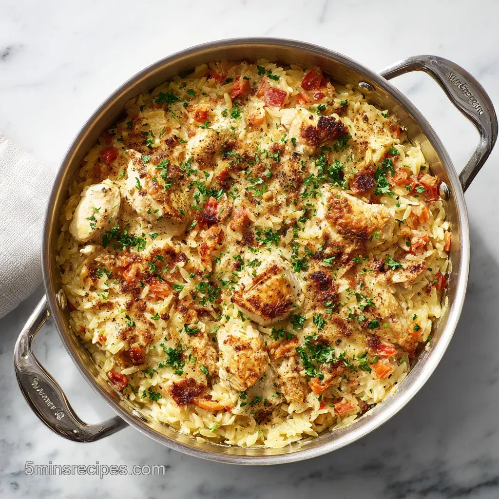 The Starch Bridge: As the orzo simmers in the chicken broth, it releases natural starches that act as a thickening agent, binding the liquid to the melting cheese. This creates a glossy, velvety sauce that mimics a slow cooked risotto without the constant stirring.