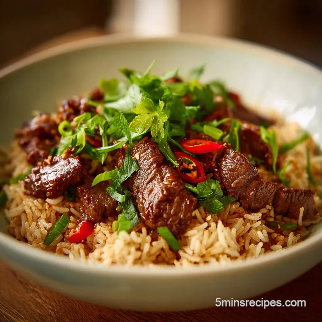 - Flavor/Texture Hook: Savory, umami rich beef paired with velvety, separate rice grains